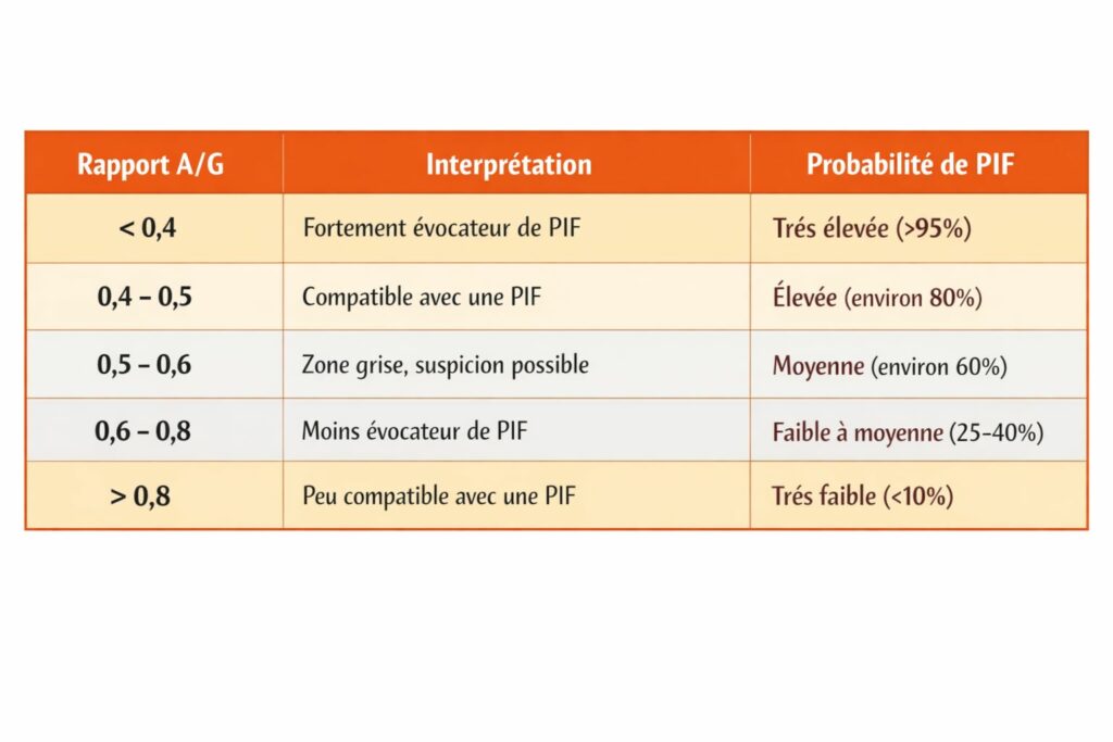 Le rapport Albumine/Globuline (A/G) est un outil clé dans la détection d’une réponse inflammatoire, souvent présente chez les chats atteints de PIF. Voici ce que signifient les différents seuils :